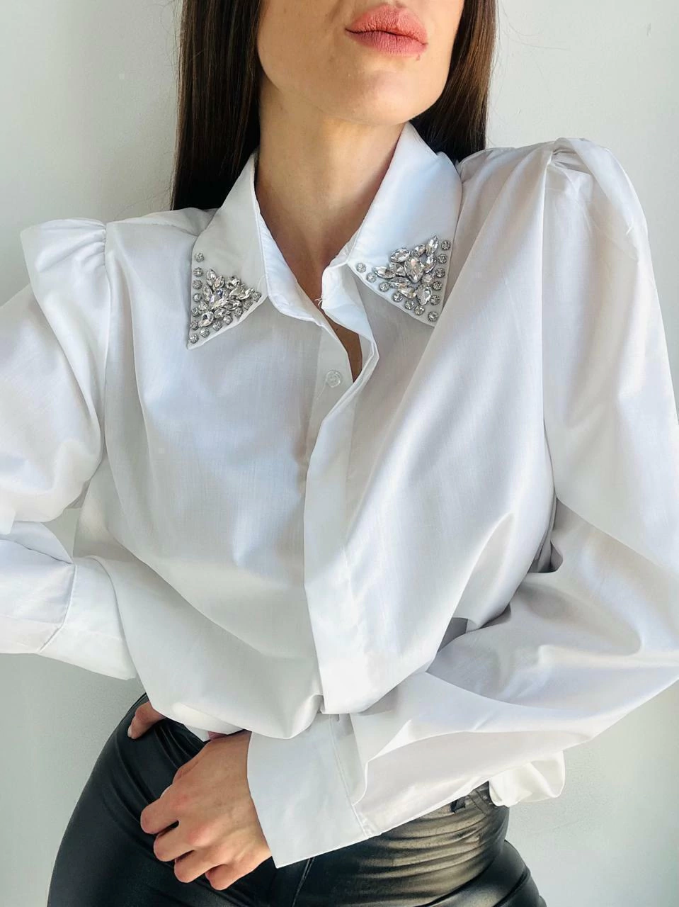 Camisa Aurora es ideal para realzar cualquier look con un aire romántico y delicado. Confeccionada en tela natural, destaca por su cuello decorado con piedras y sus mangas estilo princesa, que aportan volumen y sofisticación. Es esa prenda que podés llevar tanto en un look de día elegante como en una salida nocturna especial.