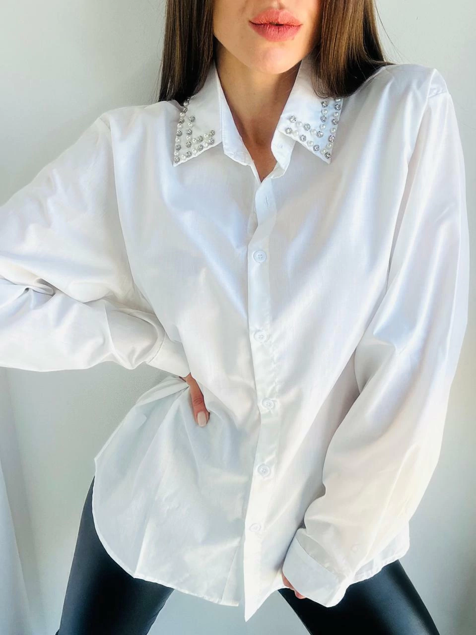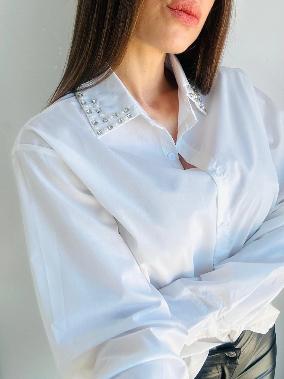 Camisa Gala es la prenda perfecta para elevar tu estilo con un toque delicado y sofisticado. Su diseño clásico se realza con apliques de piedras y perlas en el cuello, logrando un detalle único que marca la diferencia. Ideal para acompañar looks formales o darle un aire refinado a un outfit casual.