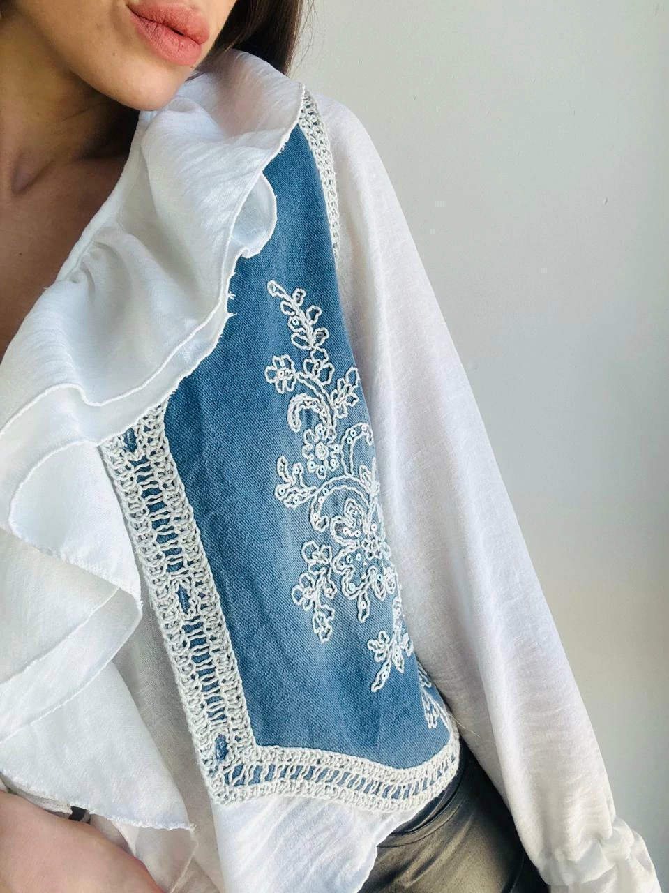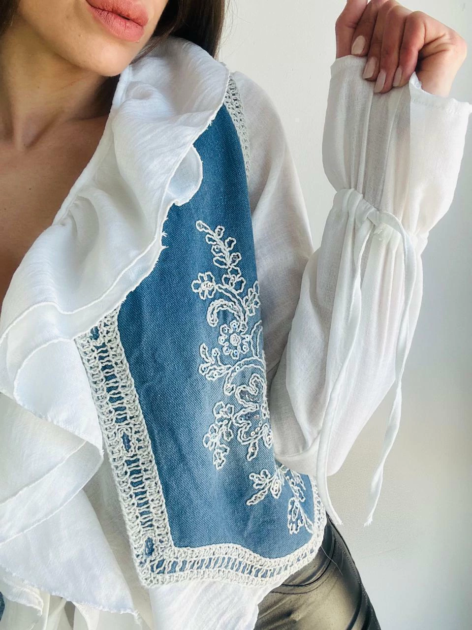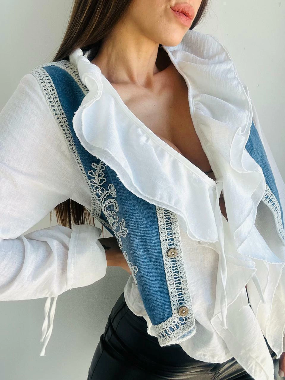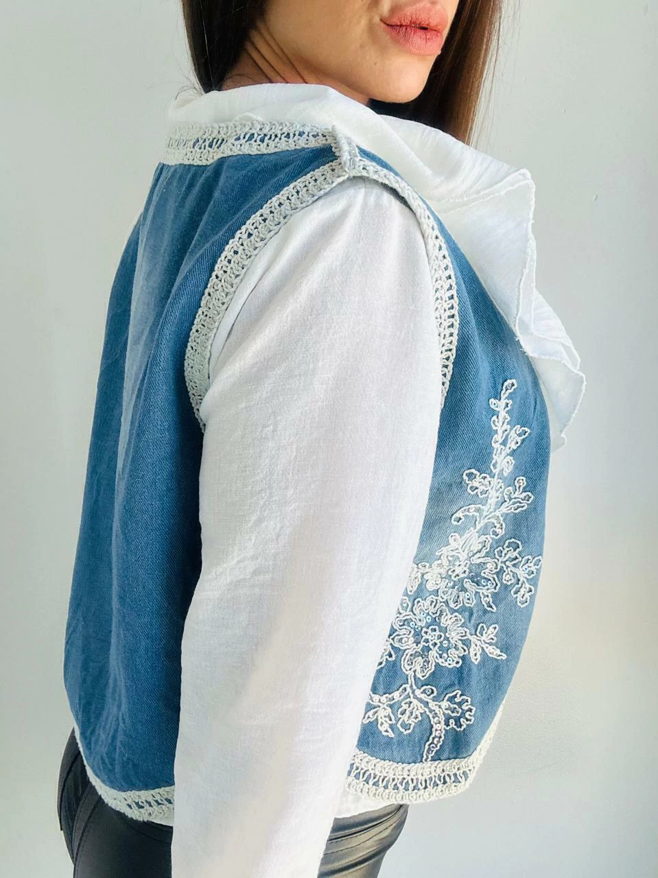 Chaleco India es esa prenda especial que transforma cualquier look con un aire único 🌸. Confeccionado en jeans, se destaca por su bordado de flores en hilo combinado con lentejuelas, un detalle artesanal que le da brillo y sofisticación sin perder la frescura del denim. Es ideal para superponer sobre remeras, blusas o vestidos y lograr un estilo con personalidad.