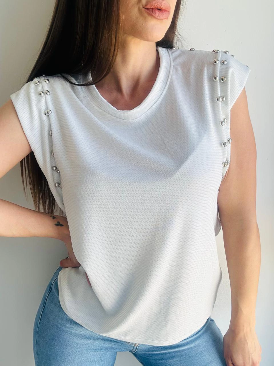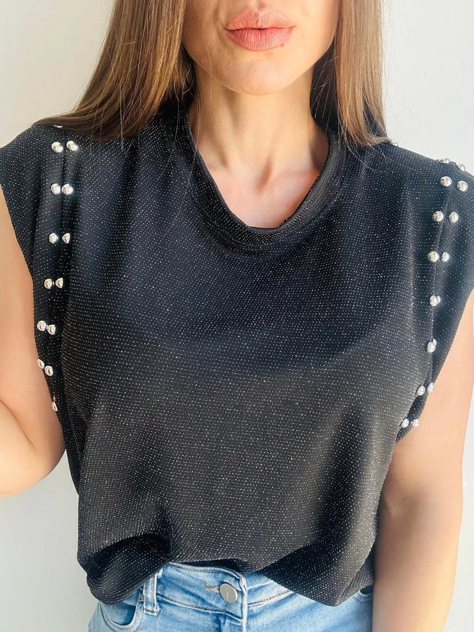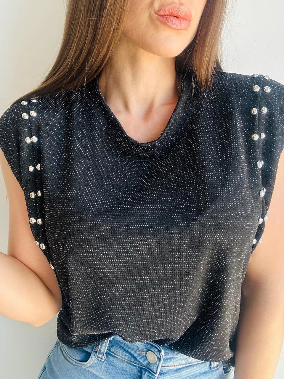 Musculosa Vecca es ese básico con power que no puede faltar en tu placard. Está confeccionada en lurex suave con brillo sutil, escote en U y un detalle de tachas en las mangas que le da un giro audaz y moderno. Ideal para elevar looks simples y sumar un toque glam sin esfuerzo.