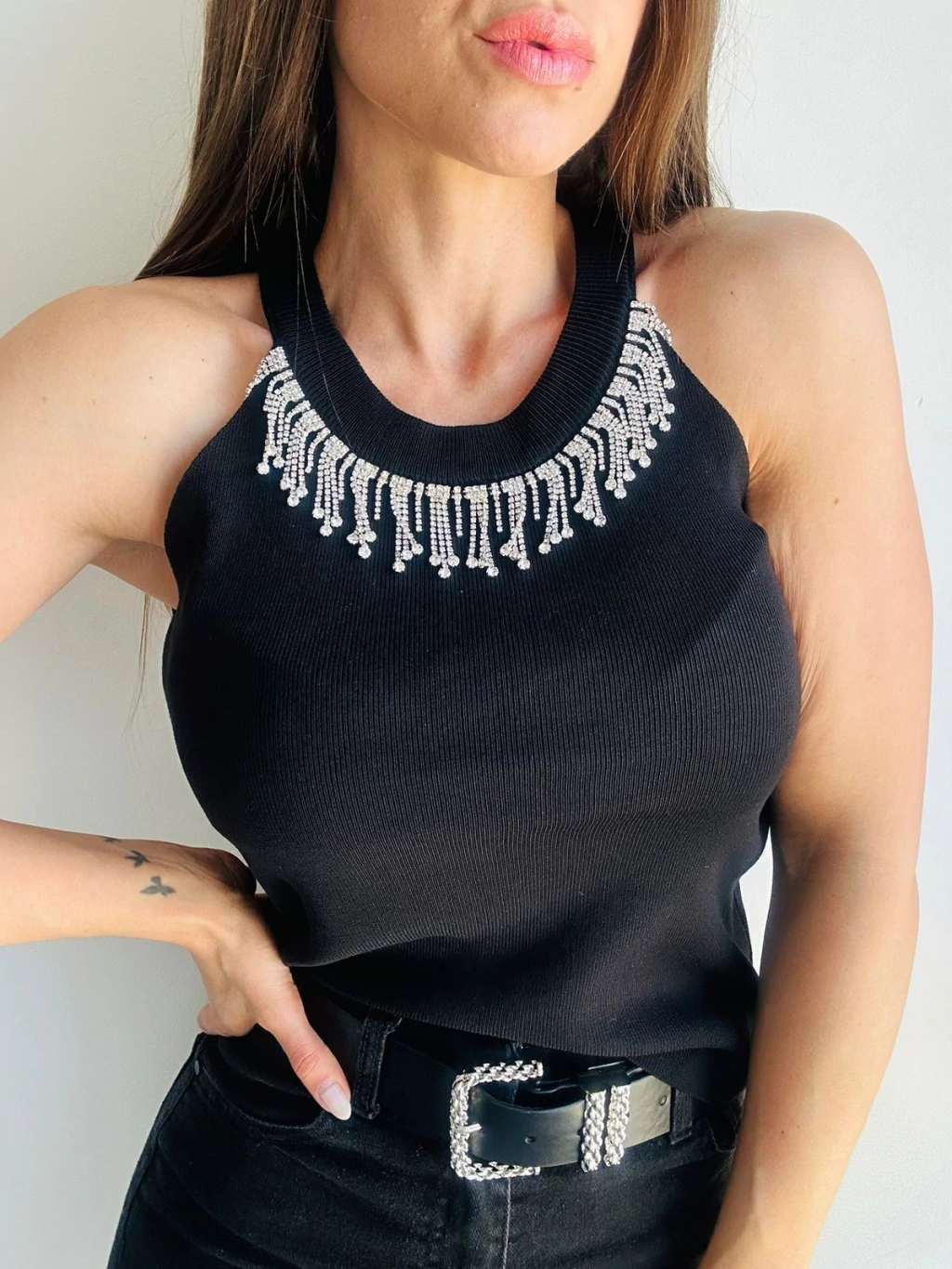 La Musculosa Chanel eleva tu estilo con su diseño sofisticado y su encanto atemporal. Confeccionada en hilo lycra, tiene cuello halter y se destaca por el detalle de tiras de strass que iluminan el escote con un toque glam. Es esa prenda que transforma un look básico en algo inolvidable.