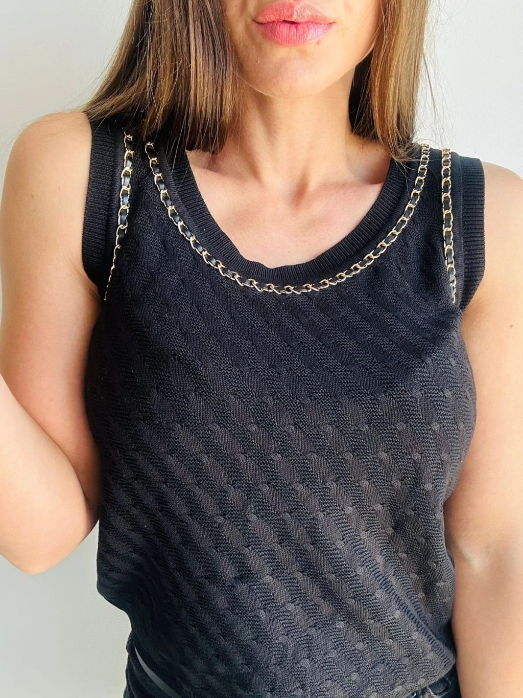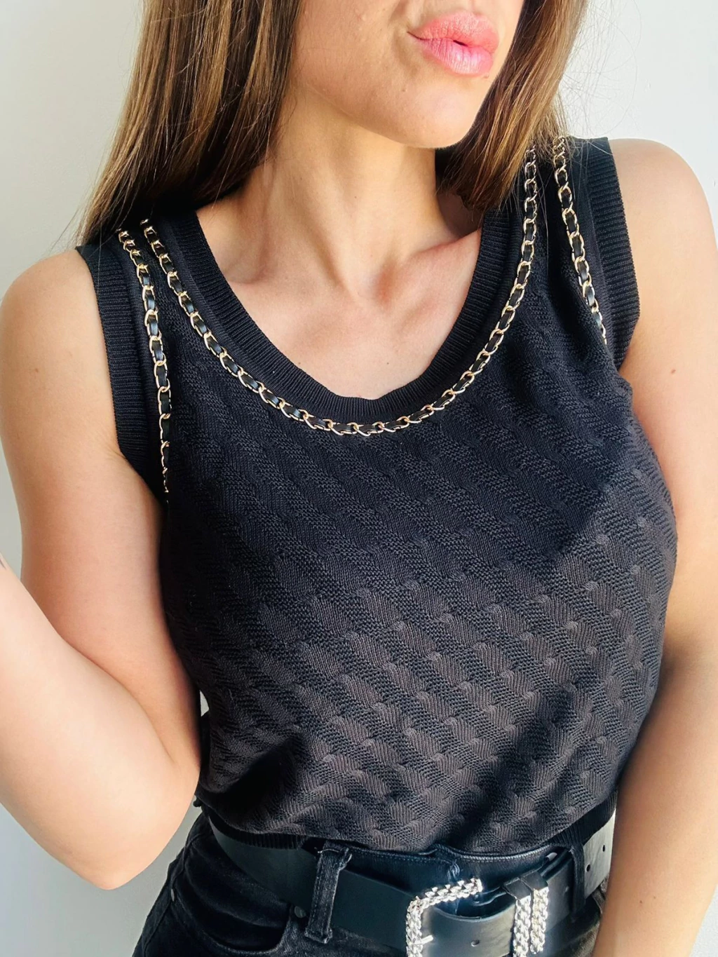 La Musculosa Lucía es una pieza con carácter, confeccionada en hilo lycra que se adapta con suavidad al cuerpo. Su diseño se destaca por el detalle de cadena dorada y tiras de ecocuero en el frente y la espalda, aportando un toque moderno y sofisticado. El escote en U y las tiras anchas la convierten en una opción ideal para elevar cualquier look.