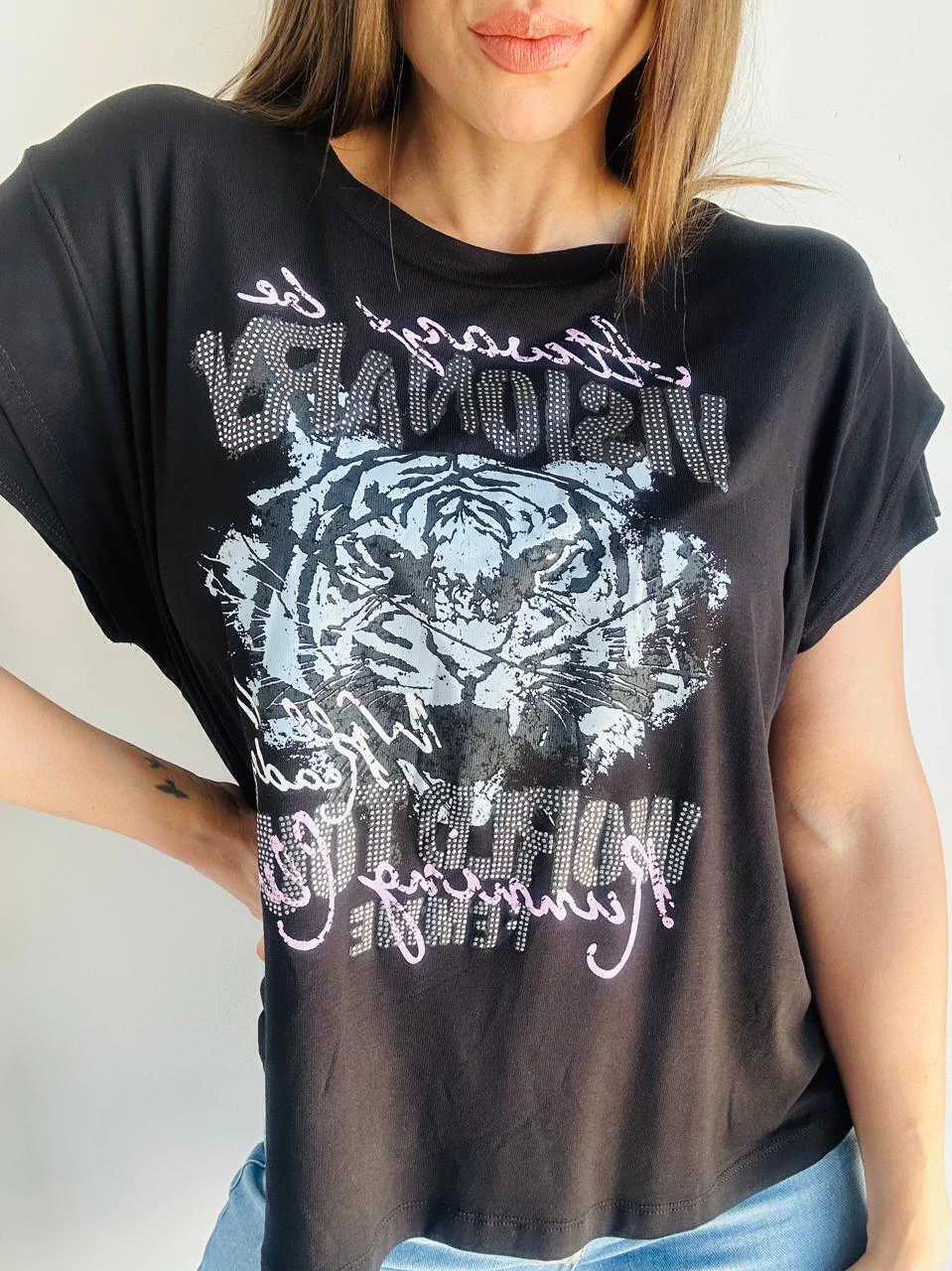 Remera Eva está confeccionada en modal bien elastizado que se adapta al cuerpo y realza tu figura. Su diseño incluye escote en U y una poderosa imagen de tigre acompañada por frases en letras con acabado plateado que suman brillo y personalidad. Es una prenda para mujeres que pisan fuerte, con estilo y seguridad.