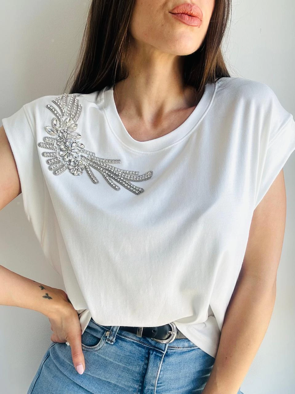 Remera Sara está confeccionada en modal con lycra, lo que la hace suave, cómoda y con un calce ideal. Su escote en U realza el cuello y el detalle de piedras en el costado suma un brillo delicado y sofisticado. Es una prenda básica con ese "algo especial" que transforma cualquier look.