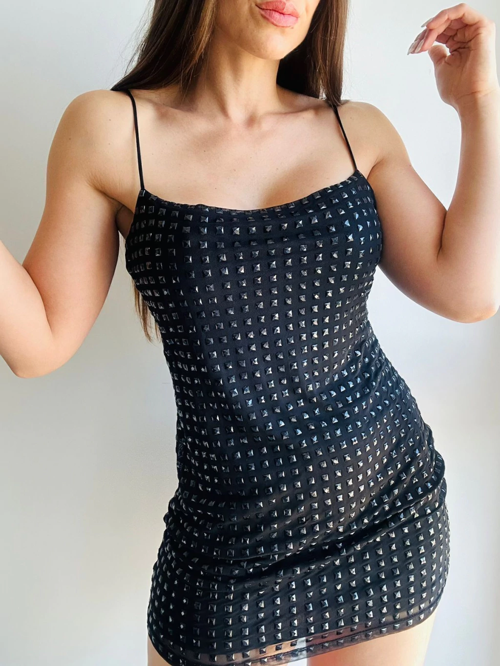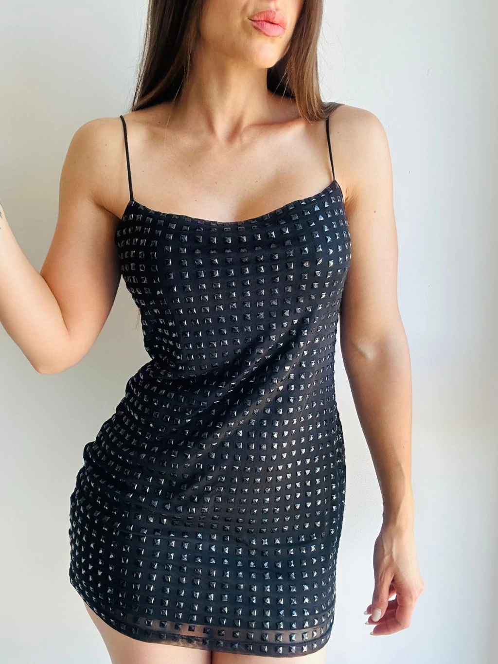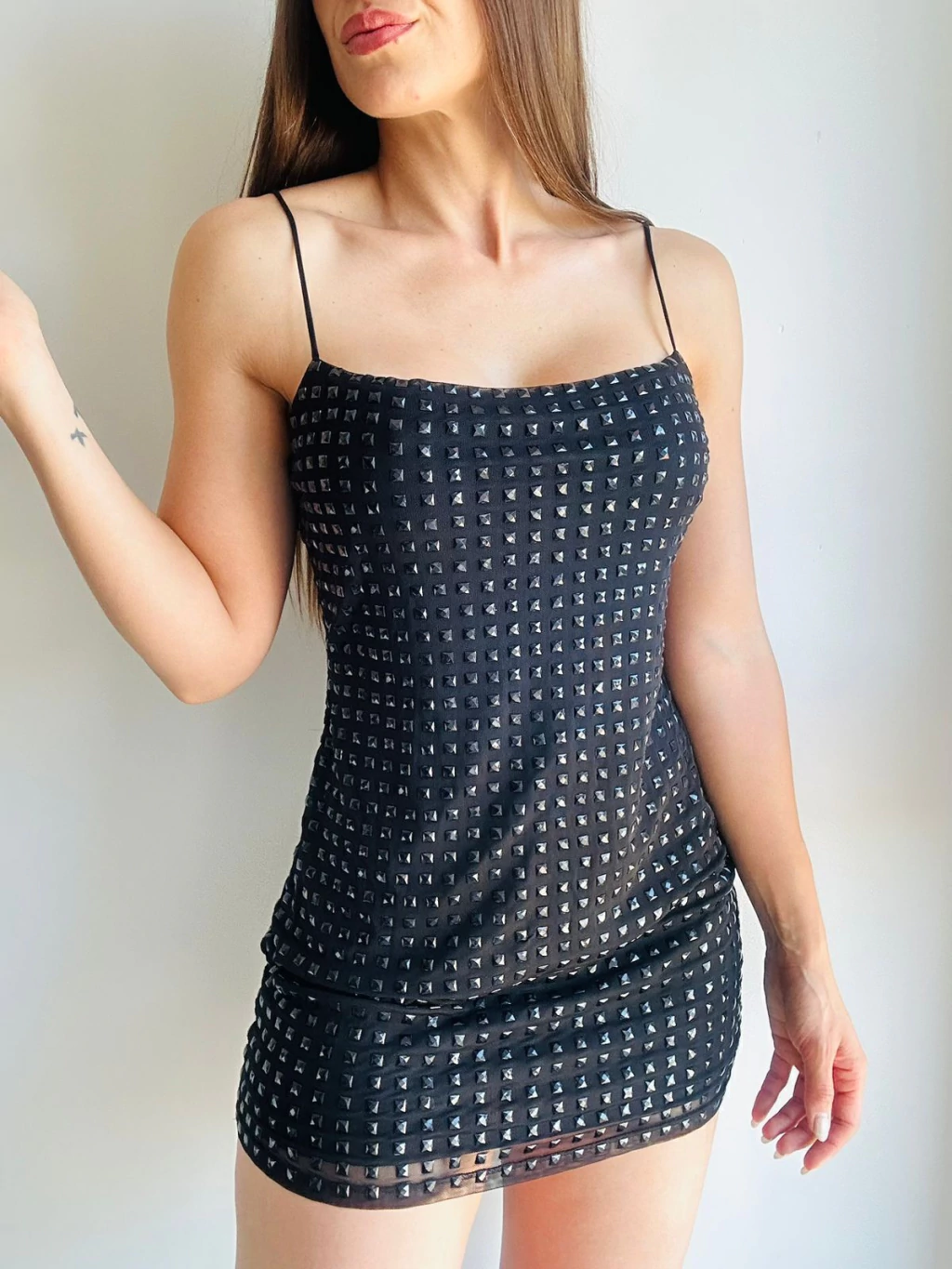 El vestido Indira es una pieza que deslumbra. Confeccionado en microtul con detalle de strass cuadrados, su diseño con escote recto y tiras finas regulables eleva cualquier ocasión especial. Tiene doble tela (no transparente) y un cierre en la espalda para mejor ajuste.